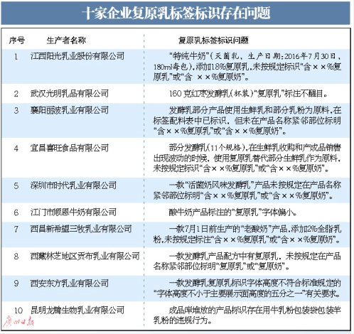 這10家復(fù)原乳標(biāo)簽存在問題的企業(yè)中,有6家使用了復(fù)原乳卻完全不做標(biāo)注;有三家“復(fù)原乳”標(biāo)注顏色色差不明顯、字體高度不符合規(guī)定要求;另外,查處1家企業(yè)違規(guī)使用牛乳粉包裝袋包裝羊乳粉。