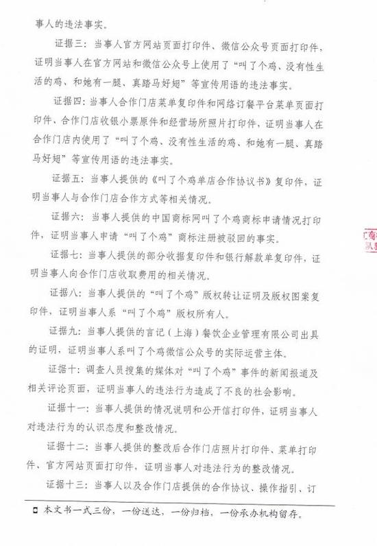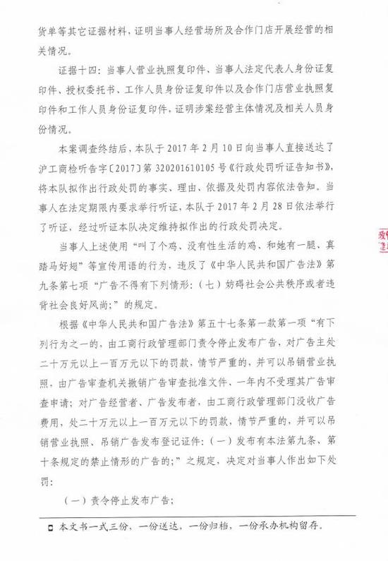 上海市工商行政管理局檢查總隊行政處罰書顯示,當事人系餐飲管理公司,主營業務是推銷和經營炸雞業務,自2016年7月起至案發,為吸引消費者和合作伙伴,當事人通過官方網站、微信公眾號“叫了個雞”及合作門店,對發布自主創意的包含“叫了個雞,沒有性生活的雞、和她有一腿、真踏馬好翅”等違背社會良好風尚用于的廣告。