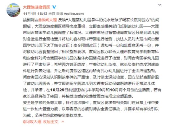 通報稱,接到網友反映的問題后,大理省級旅游度假區管理委員會領導高度重視,立即責成相關部門趕到幼兒園調查。